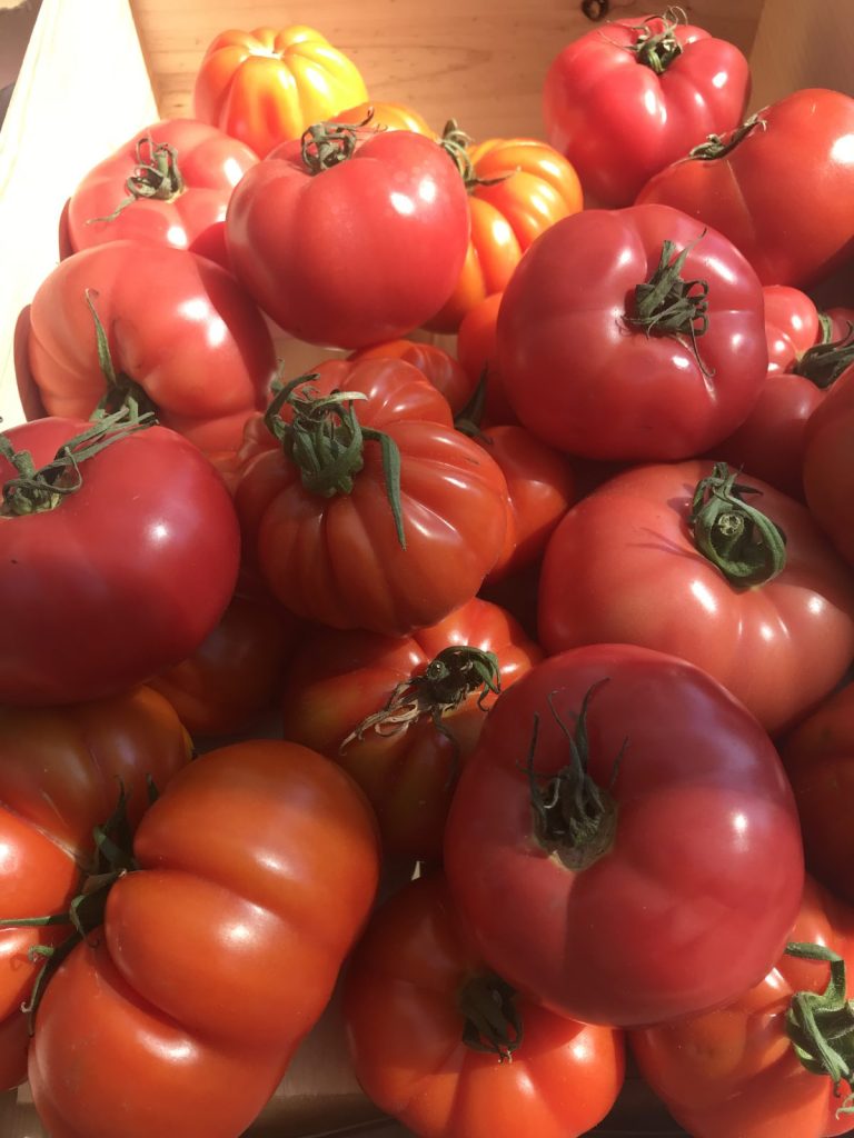One bin holds a collection of deep red heirloom tomatoes, another those with a more pinkish cast and still another tomatoes of a golden variety she claims might be among the sweetest I’ve tasted (and she’d be right). There are tomatoes still green, too, that match the bags of basil and lettuce that round out the display.